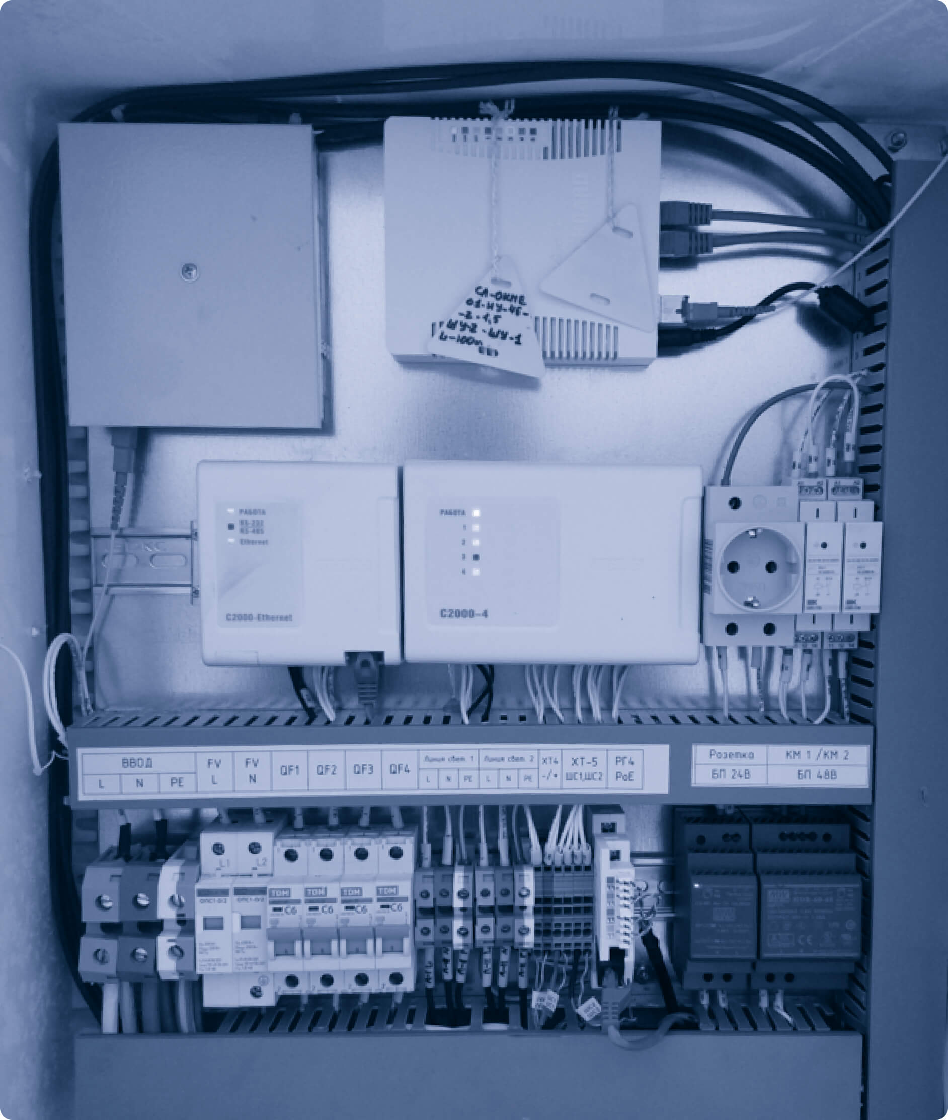 В данном ШУ, в дополнении к существующему оборудованию ШУ-600, добавлен прибор Болид С2000−2 для организации системы контроля и управления доступом (СКУД). Обычно устанавливается на въезде около ворот и калитки.